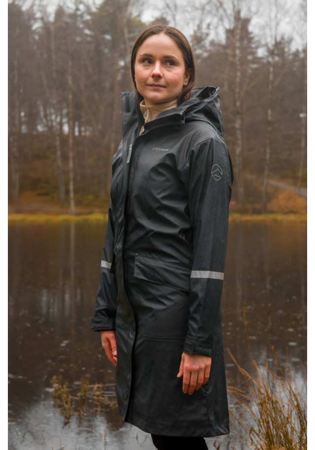 Nordsjø regnparkas til dame er en klassisk og tidløs regnkåpe designet for å holde deg tørr på regnfulle dager. Parkasen er laget i et solid PU-materiale med 2-veis stretch, som sikrer komfort og gir deg god bevegelighet selv i dårlig vær.