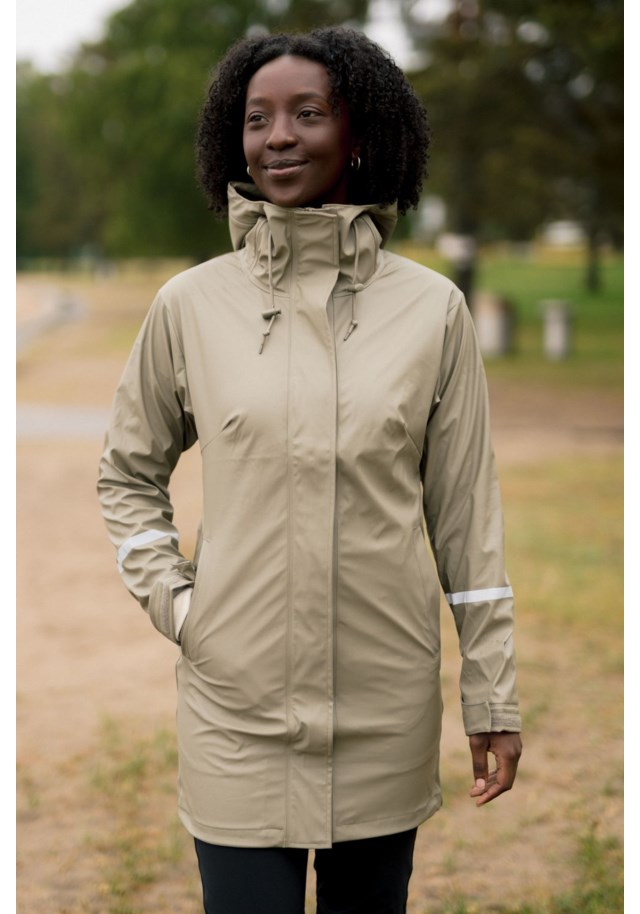Materiale: 100% polyamid. Vannavstøtende glidelåser: Ja. Ventilasjon under armene: Ja. Antall lommer: Fem. Farge: Light brown. Størrelse: S.