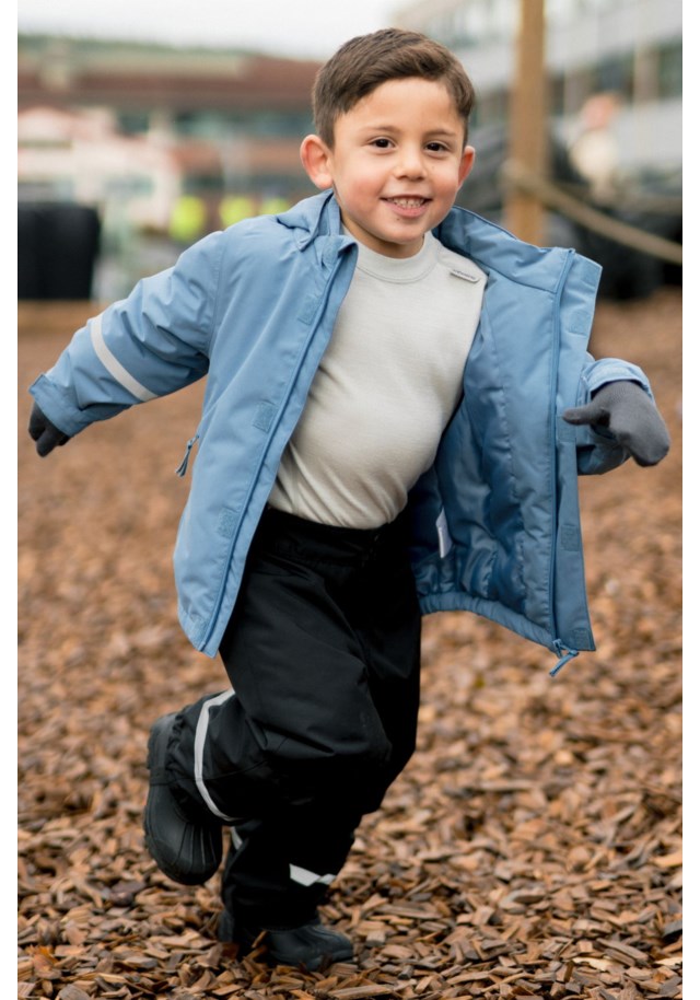 Materiale: 100% polyester. Vanntette sømmer: Teipede. Vannavvisende overflate: Fluorkarbonfri. Snitt: Smalt. Farge: Black, Blue ocean. Størrelse: 116, 122, 128,...